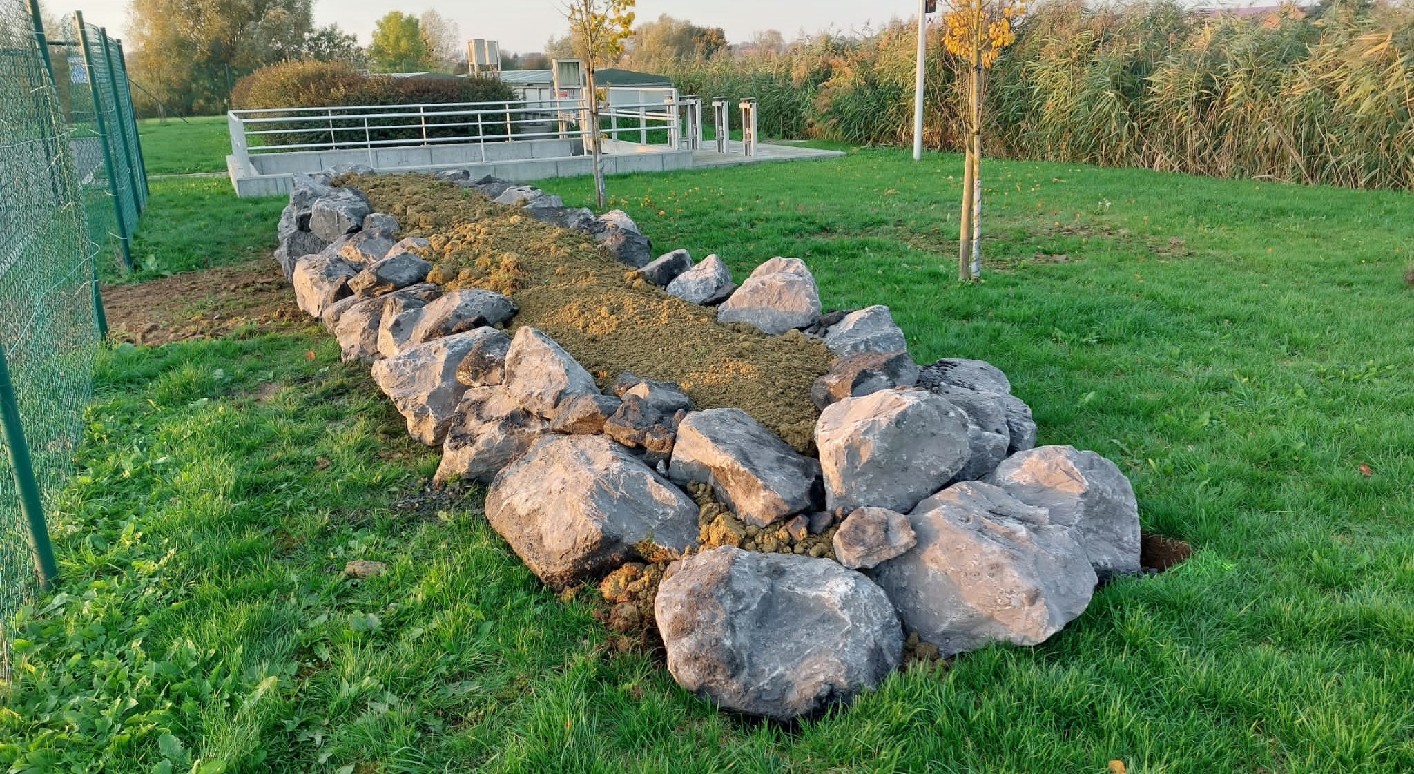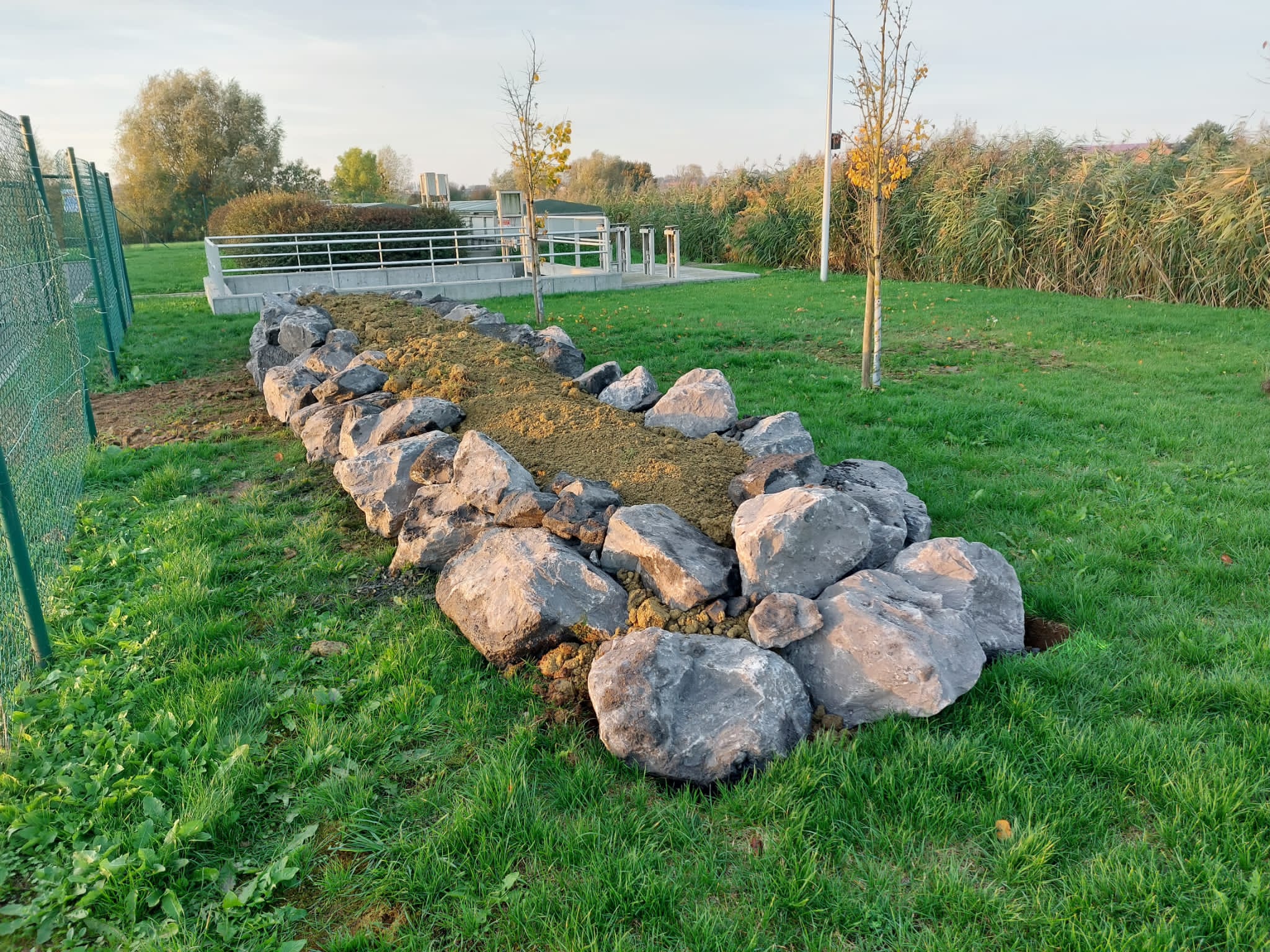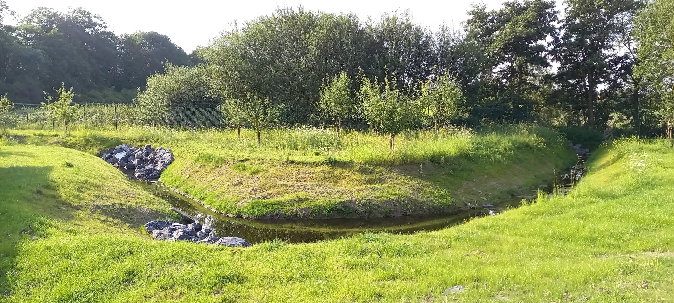 Pour maximiser l’impact écologique, les berges et talus ont été ensemencés avec des mélanges de graines spécialement adaptés aux zones humides. Des plantes aquatiques, telles que des iris et des phragmites, ont été repiquées dans le lit du « ruisseau » afin de renforcer la biodiversité locale.
