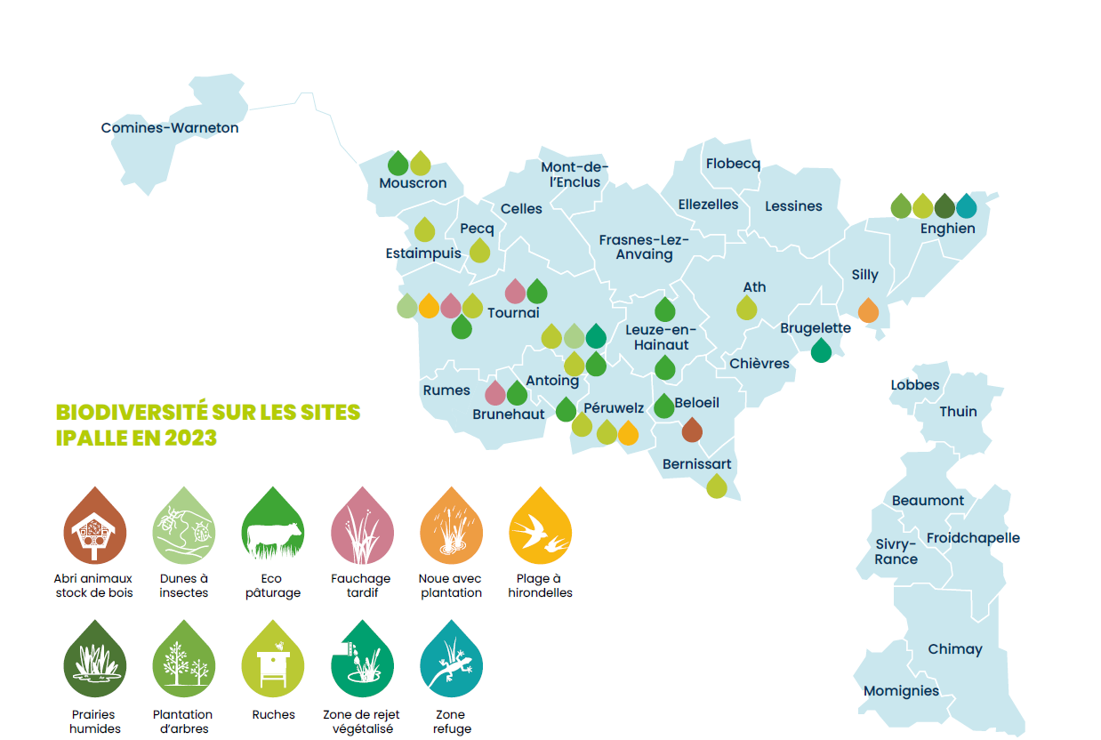 IPALLE participe également à ce projet et comptabilise plus de 1.000 arbres, 9.000 mètres de haies et 35 hectares non imperméabilisés (zones de faucardage, fauchage tardif, parterres, pelouses et plans d’eau) sur l’ensemble de ses sites.