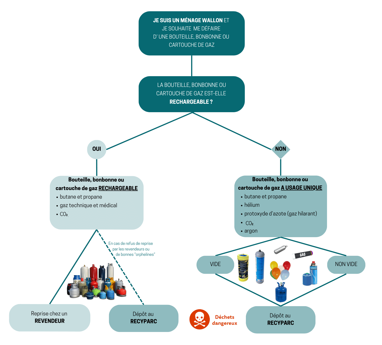 Ces bonbonnes et bouteilles de gaz ne peuvent pas se retrouver dans les PMC ou dans les ordures ménagères mais doivent être déposées au recyparc ou chez un repreneur agréé. Pourtant, trop de bonbonnes arrivent encore dans les centres de tri et les unités de valorisation énergétique du pays, causant d’importants dégâts lors d’explosions. En plus d’entraîner des arrêts complets des fours pendant de nombreuses heures, l’explosion des bonbonnes endommage gravement les infrastructures et compromet la sécurité du personnel.